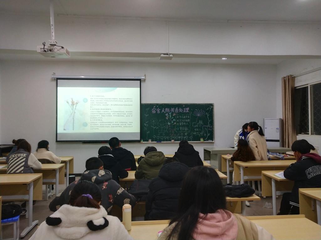 会议上,主持人通过放映PPT,围绕“日常的沟通技巧”、“常见的矛盾冲突”、“潜在的心理问题”三个方面,详细阐述了如何避免和化解寝室内的各类情况,并着重说明了健康心理的重要性。他要求寝室长们积极发挥桥梁作用,帮助寝室成员搭建良好人际关系;主动担当寝室内的“心理医生”,帮助寝室成员走出负面情绪;做好寝室监察工作,协助老师进行寝室管理。他讲到:“作为员工干部,我们应承担起自身的责任与义务,对同学负责,对老师负责,对自己负责。”最后,他对各寝室长提出的问题进行一一解答。
