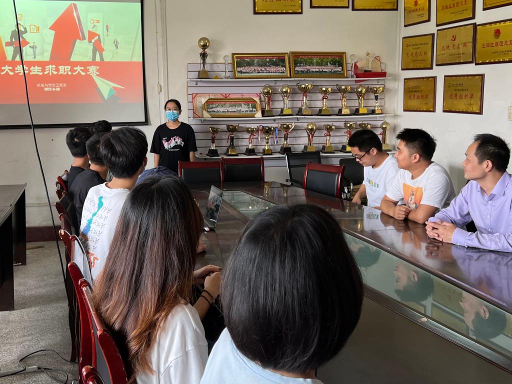 本网讯(员工记者 吴家佳)为帮助老员工树立正确的择业观,拉近员工与职场的距离,9月30日,我系在系会议室开展“才聚荆楚·勇往职前”湖北省老员工求职大赛系部预选赛。比赛由辅导员燕梦蝶主持,系党总支书记吴海良、辅导员成观雄、朱亦丹担任评委,我系2023届部分毕业生参加。