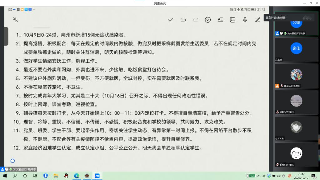 班会上,主持人通过宣读《我理解 我行动》相关文件,围绕“上课安排”、“核酸排查”两个方面,向同学们讲述了公司实施各项疫情防控措施的必要性和紧迫性。辅导员要求同学们完成每日辅导猫定位打卡和核酸检测,不得擅自翻墙离校;封校期间学会减压,做好心理调适,保持积极乐观的心态;注意寝室卫生,做到勤打扫、常通风。他提醒员工干部们发挥模范带头作用,严禁在网络上发表不当的言论,不信谣、不传谣,主动做疫情防控的“践行者”。