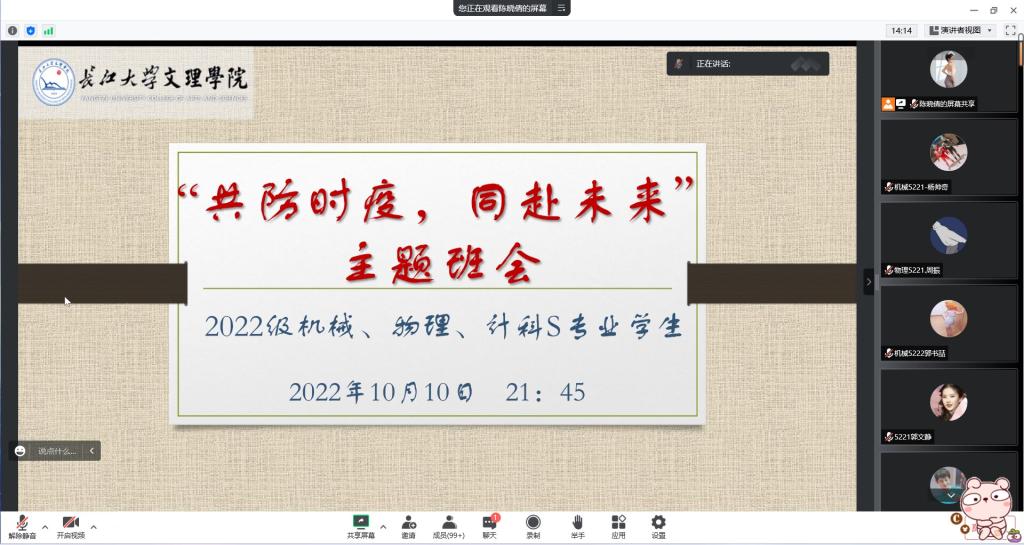 本网讯(员工记者 张瑞琦 李学哲)为了进一步做好疫情防控工作,提高员工的疫情防控知识,确保各项工作有效落实,10月10日,我系开展“共防时疫,同赴未来”校园防疫主题班会。会议由辅导员主持,我系各班同学参加。