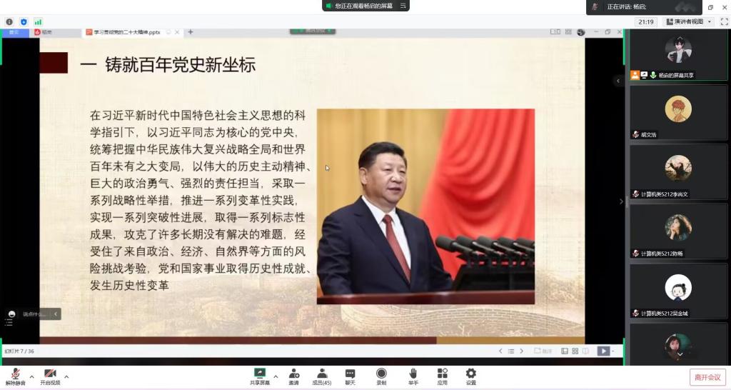 团课开始,主持人通过播放PPT,围绕“二十大内容”、“二十大精神”、“二十大意义”三个方面,总结了党在过去五年的工作和新时代十年的伟大变革。随后,主持人以“作为青年老员工,该如何看待二十大精神”为题,引发同学们的讨论,并邀请同学们发表自身看法。物理5221班李芃辉同学说道:“我们生逢伟大的时代,施展才干的舞台无比广阔,实现梦想的前景无比光明。我们要以习近平新时代中国特色社会主义思想武装头脑,团结奋斗、勇毅前行,当好二十大精神的积极传播者、忠实践行者。”