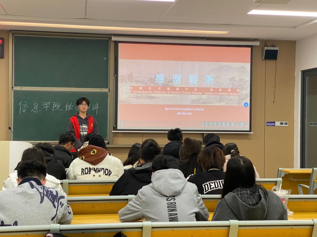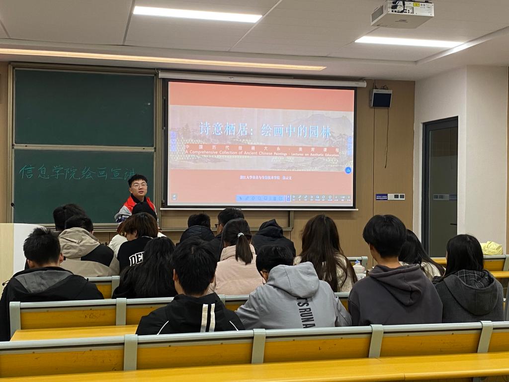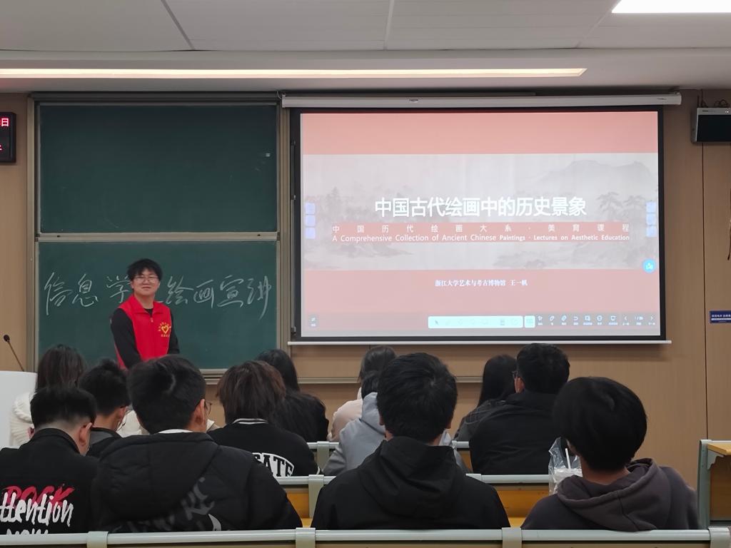 活动开始,陈雄同学向大家介绍敦煌莫高窟石窟造像及壁画制作,并给大家讲解了敦煌莫高窟的形成过程。随后,谭杰同学向大家介绍中国绘画中的历史景象,详细讲述了中国古代绘画中的历史人物和忠义故事。最后,杨志浩同学向大家介绍中国古代山水画的人文寄寓与价值,带领大家了解中国山水画的基本要素、著名画家和人文寄寓,使他们懂得了绘画艺术图像中的文化价值。
