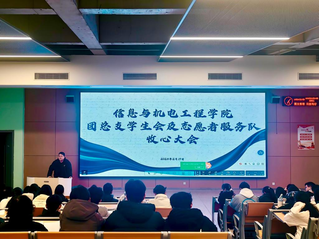 本网讯 (通讯员 李文斌/文 蔡浩文 谢天禹 覃美君/摄) 2月19日晚,公司于B-214教室举办新学期团总支员工会及志愿者服务队收心大会。本次大会由公司员工会综合办公室熊小意主持,公司党总支副书记王大专出席会议,公司团学组织全体员工干事参加会议。