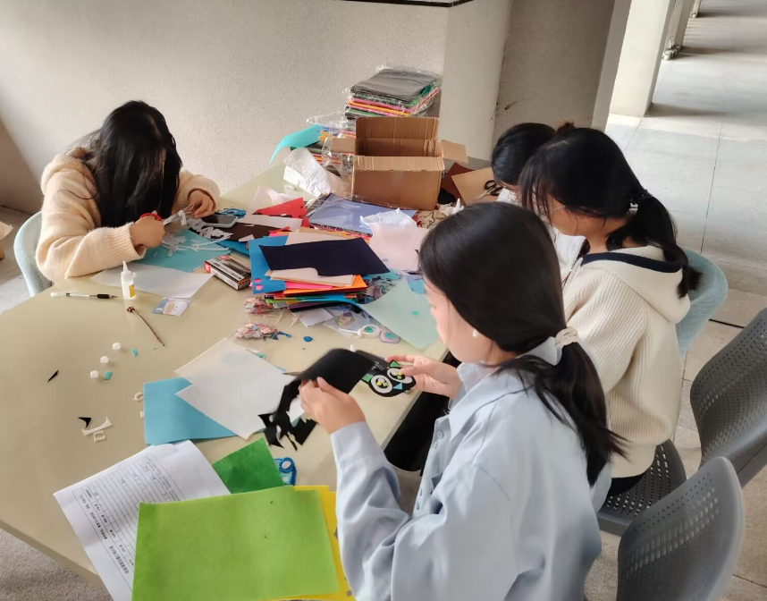 在 “姓名布贴,妙趣手作” 创意摆点活动中,同学们自主挑选彩布、剪刀、胶水等材料,将个人姓名或专属符号转化为独特设计,通过裁剪、拼接、粘贴等步骤制作个性挂件。创作过程中,师生主动交流设计思路、分享手工技巧,在专注创作中释放学业与生活压力,在作品完成时收获成就感,每一件手作都成为承载着生活热爱与美好期许的 “心灵载体”。