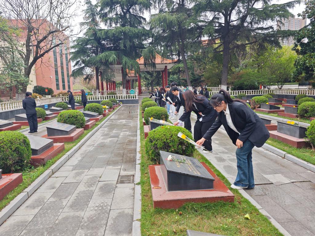活动中,同学们在主持人带领下共同缅怀革命烈士,鉴往知来。随后全体志愿者默哀,以无声的追思致敬用鲜血染红旗帜、用生命铸就丰碑的革命英烈。默哀仪式结束后,同学们进入墓园区域将备好的鲜花献给英雄,表达敬重与哀思。