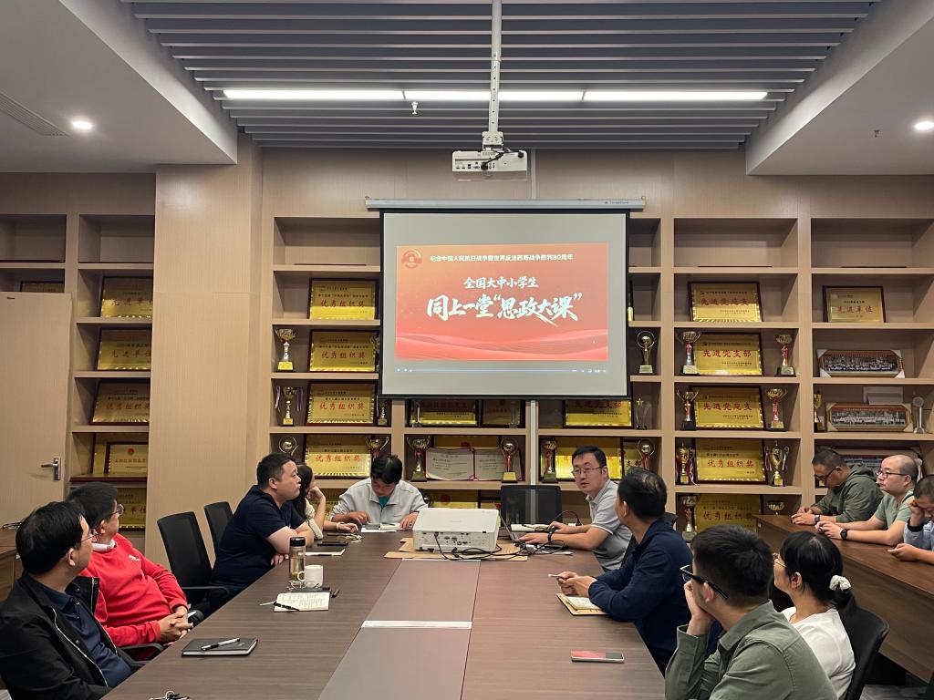 在意识形态学习教育阶段,全体教职工集体观看为纪念中国人民抗日战争暨世界反法西斯战争胜利80周年特别节目《全国大中小员工同上一堂“思政大课”》,聆听英雄故事,感悟众志成城,凝聚奋发力量。