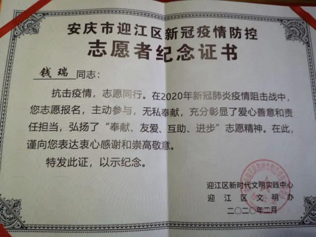 安庆市迎江区居委会授予他优秀志愿者证书,以此鼓励。面对采访,他认真讲道:“面对疫情的肆虐,全国各地街道(乡镇)及社区的党员们纷纷放弃假日与亲人朋友的团聚,积极响应号召,克服各种困难,勇当守护人民生命安全的“逆行者”。他们不顾个人安危,不分白昼地奔波于居民院落、大街小巷,一家一户地走访排查、宣传科普、动员防疫、监测体温,我作为一名党员本就应该和他们一样,再苦再累又算什么,只要能对防疫做出贡献,保护了人民群众的生命财产安全,我做的一切都是值得的。