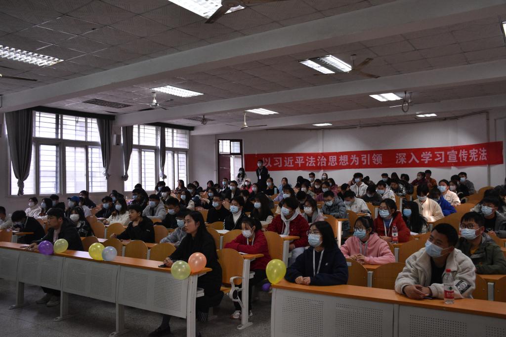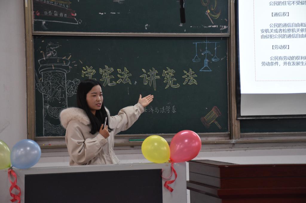 本网讯(员工记者 龚千惠 见习记者 陈燕妮 李雅雯)为弘扬宪法精神,在国家宪法日到来之际,本周五(12月3日)下午三点,经法系在4教300举行了以“学宪法,讲宪法”为主题的宪法宣传日讲座。本次讲座由法学教研室姜婷婷老师为同学们讲解宪法知识。辅导员卢佳智参加活动,经法系全体员工党员、员工会成员和各班员工代表参加活动,活动由法学教研室主任周密老师主持。