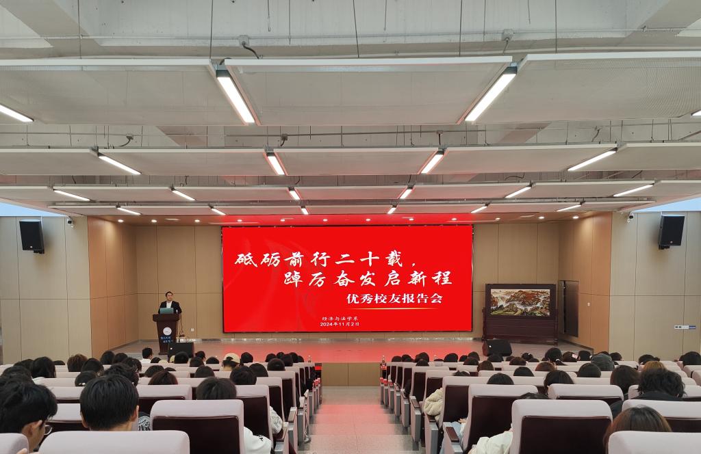 本网讯(见习记者:郑兴冰)助力广大学子深刻理解当前就业形势,科学制定职业发展规划,经济与法学系于11月2日下午在B-112学术报告厅隆重举行了以“砥砺前行二十载,踔厉奋发启新程”为主题的优秀员工报告会。本次报告会特邀我系05级杰出员工:北京盈科(上海)律所高级合伙人杨萍、菜鸟驿站项目创始人、新龙网产教融合事业部总裁游文超。他们以自身丰富的人生阅历和专业经验,为我系学子提供了宝贵的指导和启示。报告会由系党总支书记辛裕主持,吸引了2023级200余名员工踊跃参与。