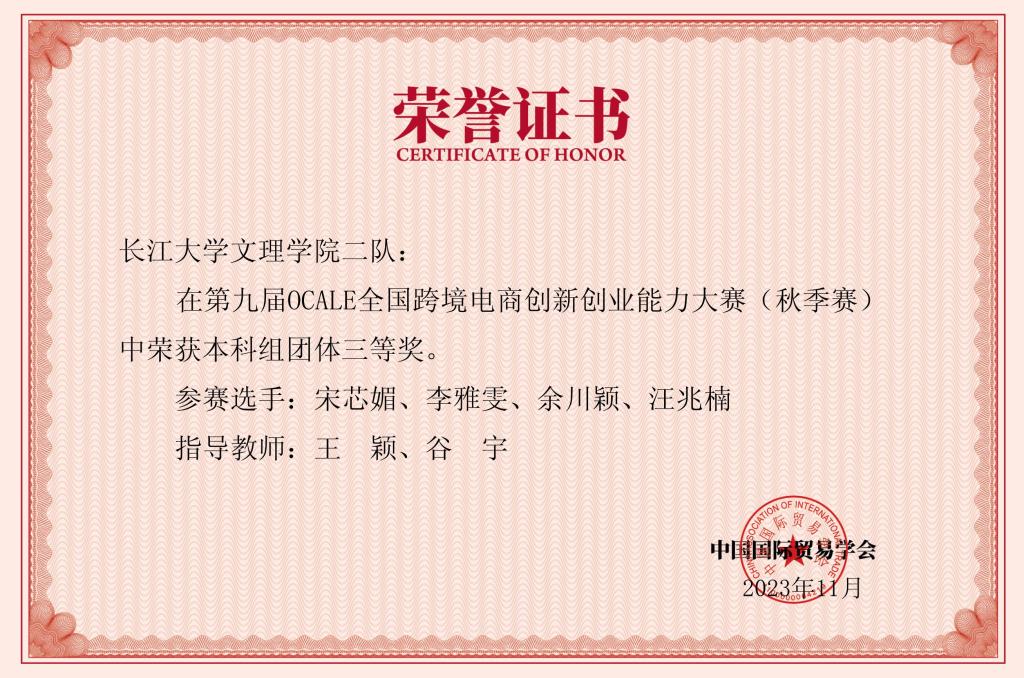 第九届OCALE全国跨境电商创新创业能力大赛团体三等奖