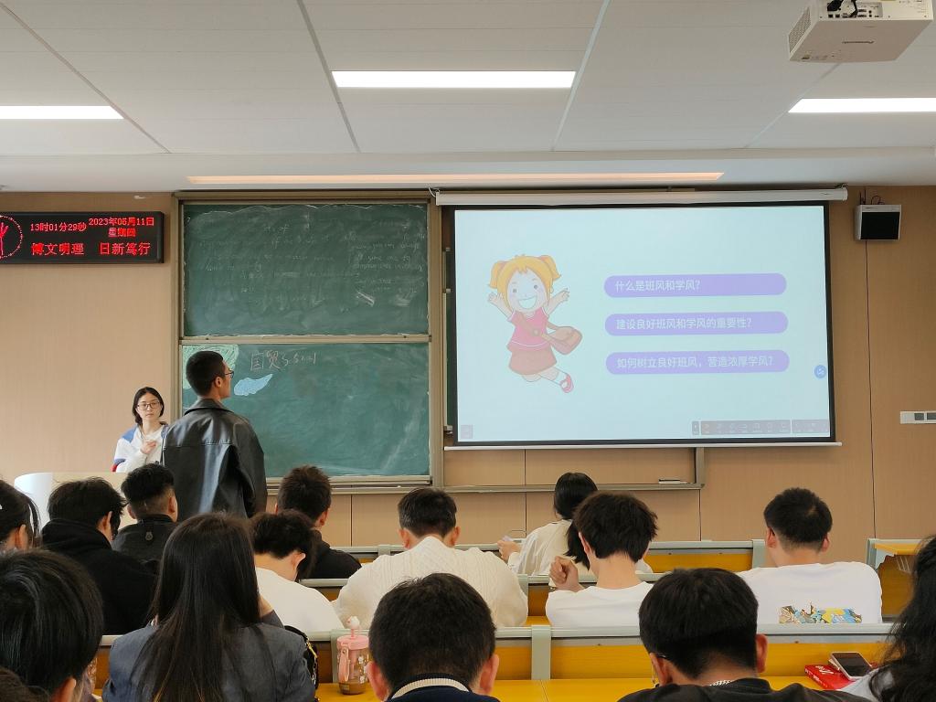 本网讯(见习记者 田琼钕)贯彻落实公司2023年教风、学风、师德师风建设月活动,促进我系学风建设的深入开展,营造良好的学习环境和学习氛围,2023年5月11日,经济与法学系以班级为单位召开“浓厚学风、充实你我”主题班会,本次班会由各班班长主持,辅导员参加各班班会。