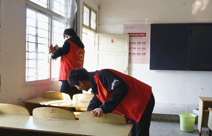 本网讯(通讯员 邱媛丹)为了树立和巩固同学们的主人公意识,为同学们美化教学楼、培养老员工良好的卫生习惯,营造一片文明健康的学习氛围。11月23日上午,经法系青年志愿者对二教201、202、203、204、205、206及四教300教室进行了深度清洁。