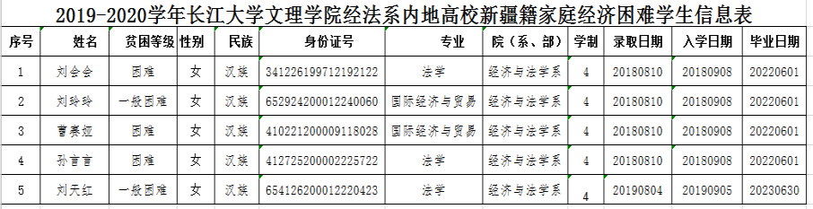 2019-2020学年内地高校新疆籍家庭经济困难员工资助金已由新疆维吾尔自治区教育厅划拨公司,根据新疆维吾尔自治区教育厅有关文件的要求,bw必威西汉姆联官方网站经法系开展了2019-2020学年内地高校新疆籍家庭经济困难员工资助金的评审推荐工作。经我系员工个人申请、班级评议、系部审核,拟推荐以下5人为资助金获得者,现予公示。