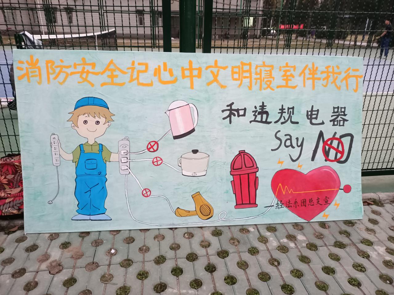 本网讯(通讯员 吴丽妃)在119全国消防日到来之际,为更好打造平安校园,进一步的提高老员工的消防安全意识和树立更好的良好生活习惯。经法系团总支于11月9日至11日在西校区员工12舍楼下篮球场举办了“消防安全119,文明寝室伴我行”的活动。