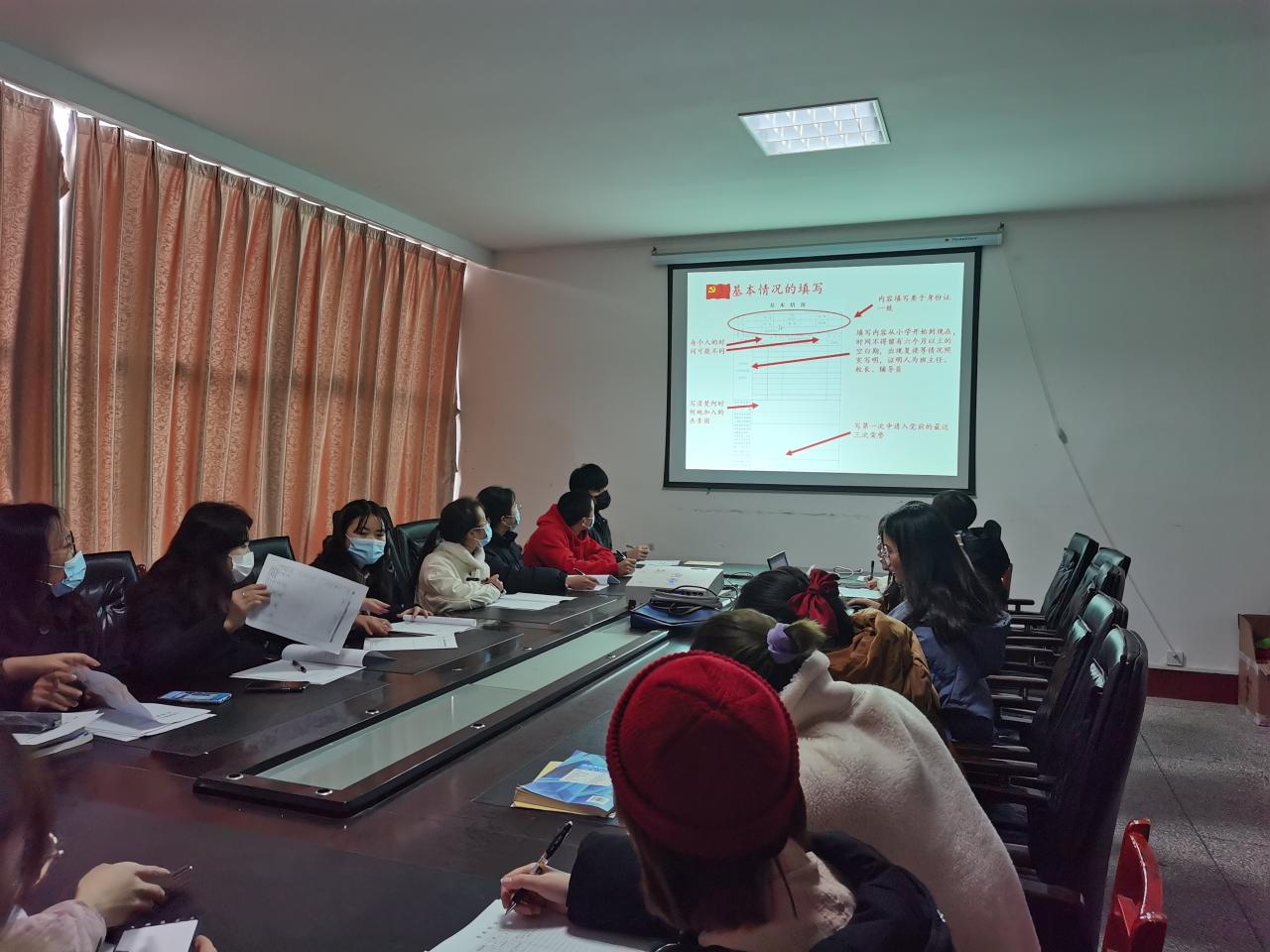 员工党员江晟瑀、黄佳林通过PPT演示向各位入党积极分子讲解了员工党员发展的大致流程与“培养教育考察表”的填写必要:“为什么要进行培养考察”、“从入党积极分子到发展对象再到预备党员需要怎么做需要培养考察多少次”;员工党员涂思雯、王嫚与各入党积极分子进行谈话并记录其思想过程。