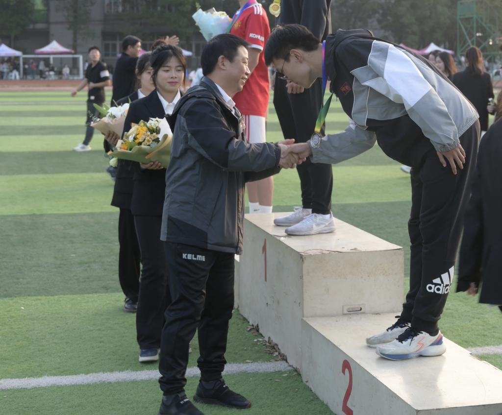 11月19日16:30,运动会闭幕式在西校区运动场举行,公司领导为获奖同学颁奖。我系运动员们在此次运动会上积极为班级添彩,为系部争光!他们以昂扬的斗志,展现出青春的激情与活力,更展现出经法学子奋勇向前、坚持不懈的拼搏精神。同时,我系团总支员工会及志愿者服务队积极发挥服务作用,每个部门分工明确,各司其职,为运动员的安全护航,存放个人物品,提供后勤保障,服务系部同学,生动的诠释了团结互助的集体精神。