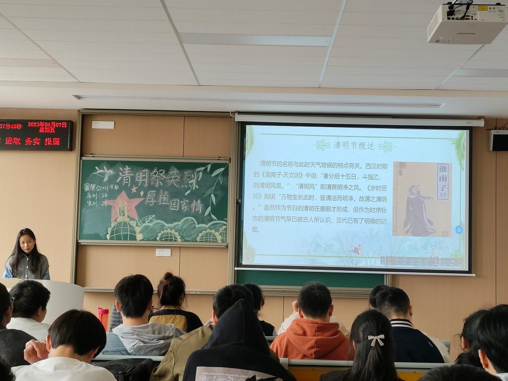 法学5223班主持人主要讲解了传统节日清明节和祭奠先烈等主要内容,以观看视频、小组交流讨论等方式了解革命先烈的事迹,学习了他们的革命精神,提高了同学们的爱国精神;国贸5211班主持人首先带领同学们了解了清明节的意义和由来,接着以提问的方式讲述革命先烈的事迹,积极鼓励同学们踊跃参与,发表自己的见解,让同学们学习烈士们顽强拼搏、自强不息的革命精神。其他班级也分别以不同方式讲解了缅怀革命先烈的意义,让同学们知道了为什么无数革命先烈为了党的奋斗目标和理想信念,抛头颅、洒热血,不怕困难、不怕牺牲、前仆后继。清明祭英烈,给广大青少年带来的不仅仅是内心和灵魂上的教育和洗礼,也引导了广大青少年向英烈学习,帮助他们树立正确的价值观和远大的理想信念,在他们的心中播洒下爱国爱党的种子。