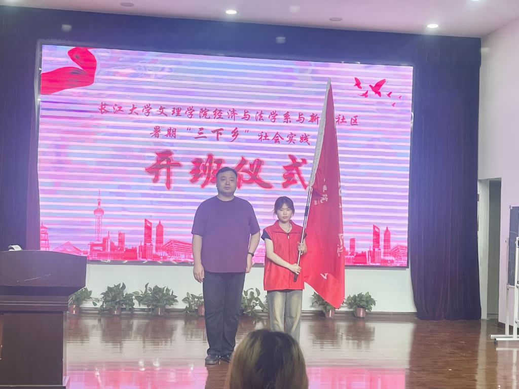 在新风社区,举行“三下乡”社会实践活动授旗仪式,城南街道新风社区纪委曾书记为实践团队授旗,至此开班仪式到此结束。