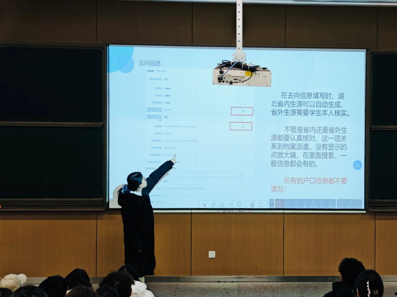 会上,刘曼莹围绕毕业去向信息填报核心环节开展详细指导,明确生源信息填报的系统自动生成范围与自主核实要求,重点强调关键信息需逐字核对、非必要信息无需额外填报,同时提醒同学们务必在规定时限内完成提交,遇系统操作、信息界定等疑问可及时联系辅导员咨询,现场演示信息搜索操作方法,以直观形式帮助同学们理清填报细节。
