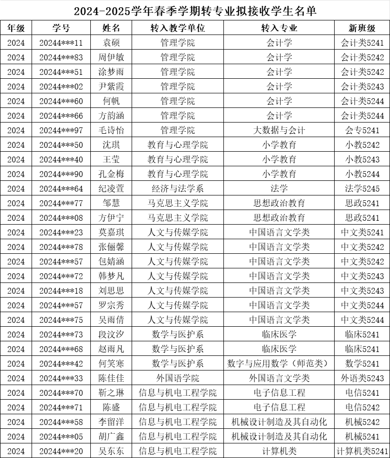 关于2024-2025学年春季学期转专业员工名单的公示
