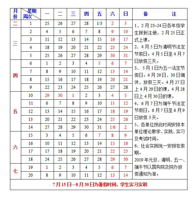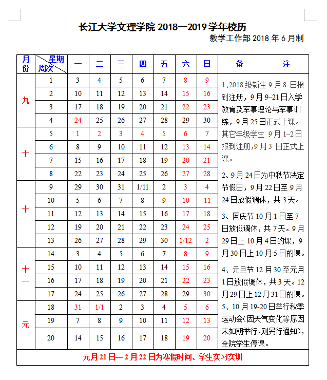 2018-2019学年校历