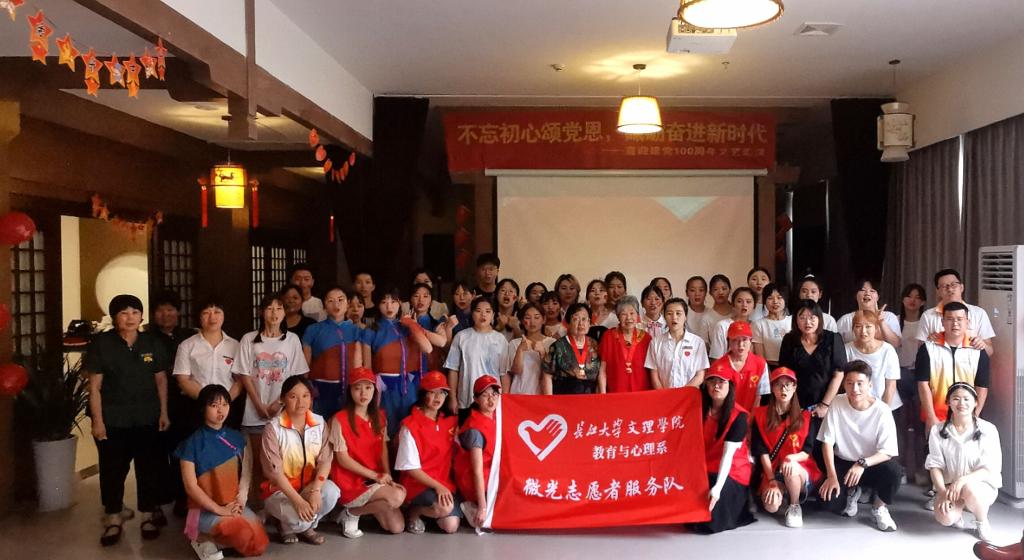 本网讯(通讯员杨天姿)遥忆百年辉煌历史,共悦世纪繁华之光。为庆祝建党100周年,7月1日上午,教育与心理系微光志愿者服务队联合荆州市四叶草社会工作服务中心在荆州区东城街道解放社区得福堂养老服务中心举办主题为“不忘初心颂党恩,砥砺奋进新时代"的文艺汇演活动。