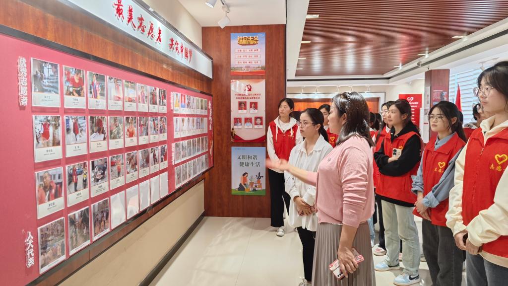 在工作人员的带领下,同学们参观了“彭国珍志愿服务队图片展”,学习巾帼志愿者“老姨妈”精神。据悉,彭国珍是沙市区白云桥社区的一名退休老党员,1992年,从荆州市绒布厂退休后,一直坚持社区志愿服务,先后获评荆州市巾帼女杰、湖北省优秀共产党员、全国最美志愿者等荣誉称号。如今,“彭国珍服务队”100多名志愿者,分为爱心帮扶、环境保护、治安巡逻、为老服务等十个小分队,继续着无私奉献的志愿服务精神,彭国珍“不求回报、不计得失”的志愿者服务精神也正是同学们的精神指引。