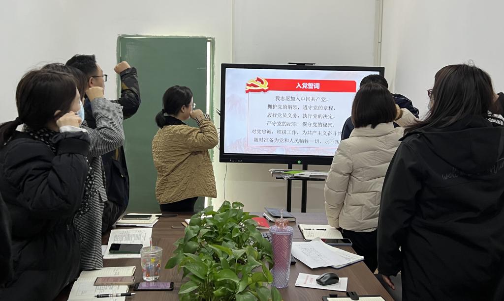 随后,全体教师党员开展了本月的支部主题党日活动。在教工支部组织委员陈莎老师的带领下,大家重温入党誓词,诵读党章(第三章),集体学习党史教育(第八章)和党的创新理论,并就党员干部如何始终保持“拼、抢、实”的状态和作风展开了主题研讨。