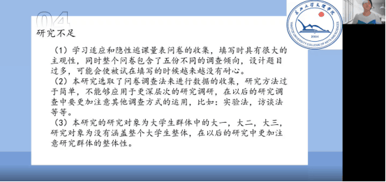 上午8时,五个答辩小组通过腾讯会议的方式准时进行,并全程录像。答辩严格按照流程进行,首先由员工围绕选题的研究背景、研究内容、研究方法、研究结果、创新点及不足之处等方面展开陈述。员工陈述完毕之后答辩评委老师进行提问,待下一位员工陈述完毕后,由前一位员工回答问题,评委老师对回答进行点评并提出合理化修改建议。整个答辩过程紧张而有序,答辩评委从论文内容到论文格式为员工指出问题及不足之处,经过6个小时左右的答辩,各组顺利完成任务。