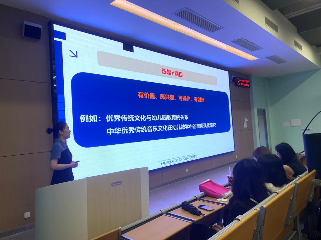 何祥苗围绕选题、查阅文献资料、分析综述文献资料、撰写开题报告、开题答辩等五部分展开讲解。她认为论文选题应有价值、感兴趣、可操作、有创新。她以“幼儿告状行为”为关键词,在中国知网进行了相应的文献检索,并对文献整理与分析的方法进行详细讲解。以《幼儿园表演游戏的现状、问题及对策研究》等开题报告为例,详细介绍了开题报告撰写的格式、内容等方面知识。
