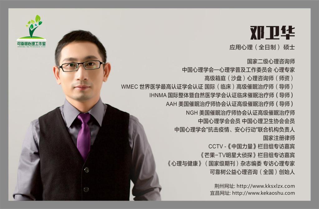 邓卫华,男,中国心理学会心理科学传播专家;国家二级心理咨询师;国际(临床)高级催眠治疗师(导师);可靠树心理咨询机构创始人。