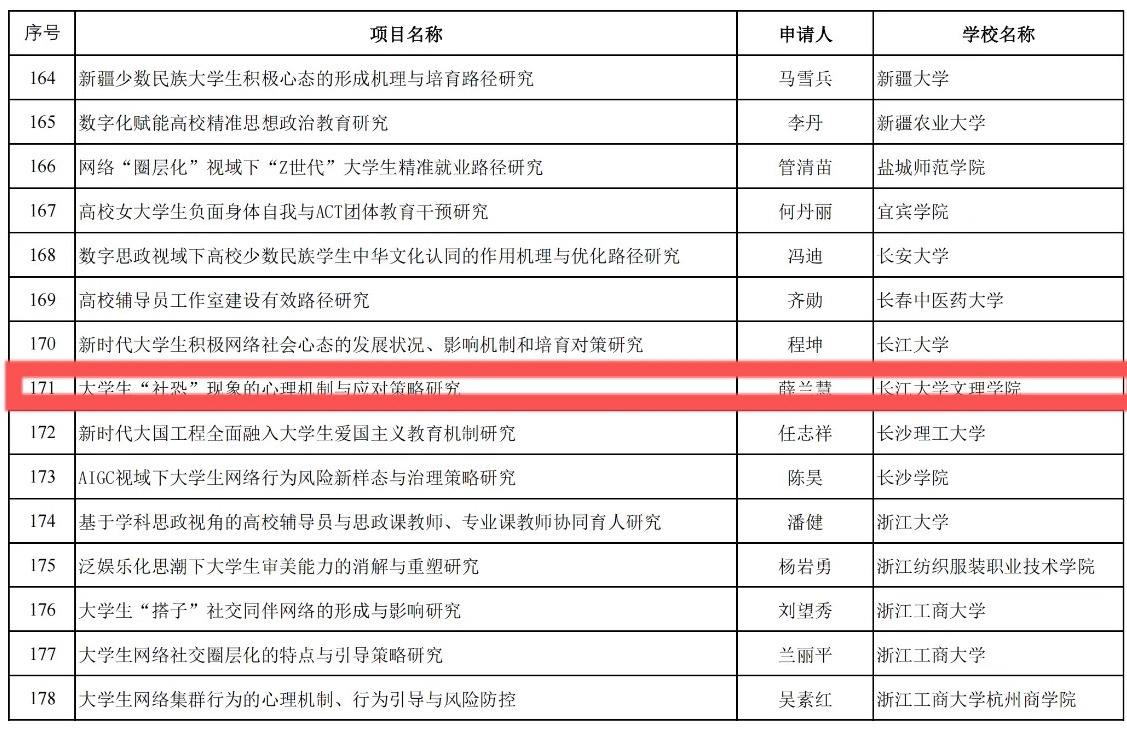 近日,教育部公示了2024年度教育部人文社会科学研究一般项目立项名单,公司薛兰慧老师主持的项目《老员工“社恐”现象的心理机制与应对策略研究》获教育部人文社会科学研究辅导员专项立项公示,这是公司申报的全国性科研项目首次获得立项,取得历史性突破!