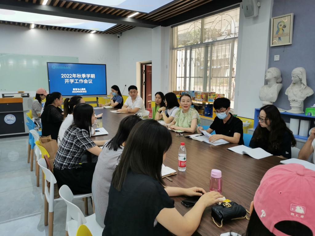会上,党总支副书记梅曼曼、副主任马君莉分别就开学期间的员工工作和教学工作进行细致的安排部署。党总支书记李刚英回顾分享了暑期就业及招生工作,并就新学期各项工作的开展提出三点要求,一是以人为本,上下齐心、拧紧一根绳做好教育系的各项工作;二是以生为本,服务育人,长期创造良好的育人环境;三是以教育系各项事业稳步推进为中心,创新发展,注重各项工作的科学研究与成果总结。同时强调新学期各部门做好本职工作,保证开学工作的稳步进行,并再次欢迎新入职的青年教师们,鼓励青年教师为系部的发展贡献自己的创新力量。