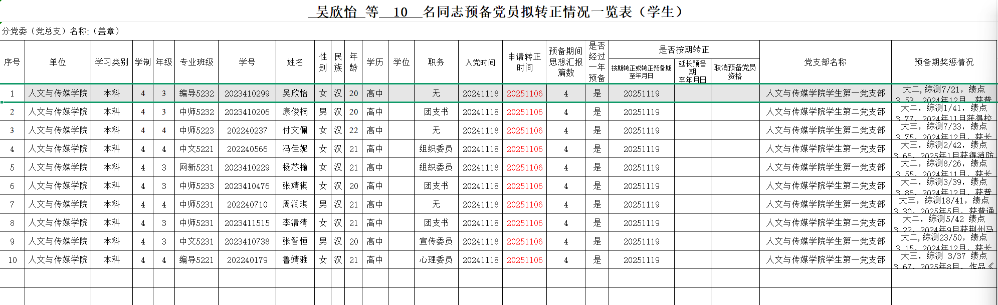 经过党支部对预备党员1年的培养教育和考察,经支部委员会研究确定,报分党委(党总支、党工委)审查同意,将于近期召开党员大会讨论吴欣怡等10名同志预备党员转正事宜,特在人文与传媒公司范围内进行公示。(见附件)