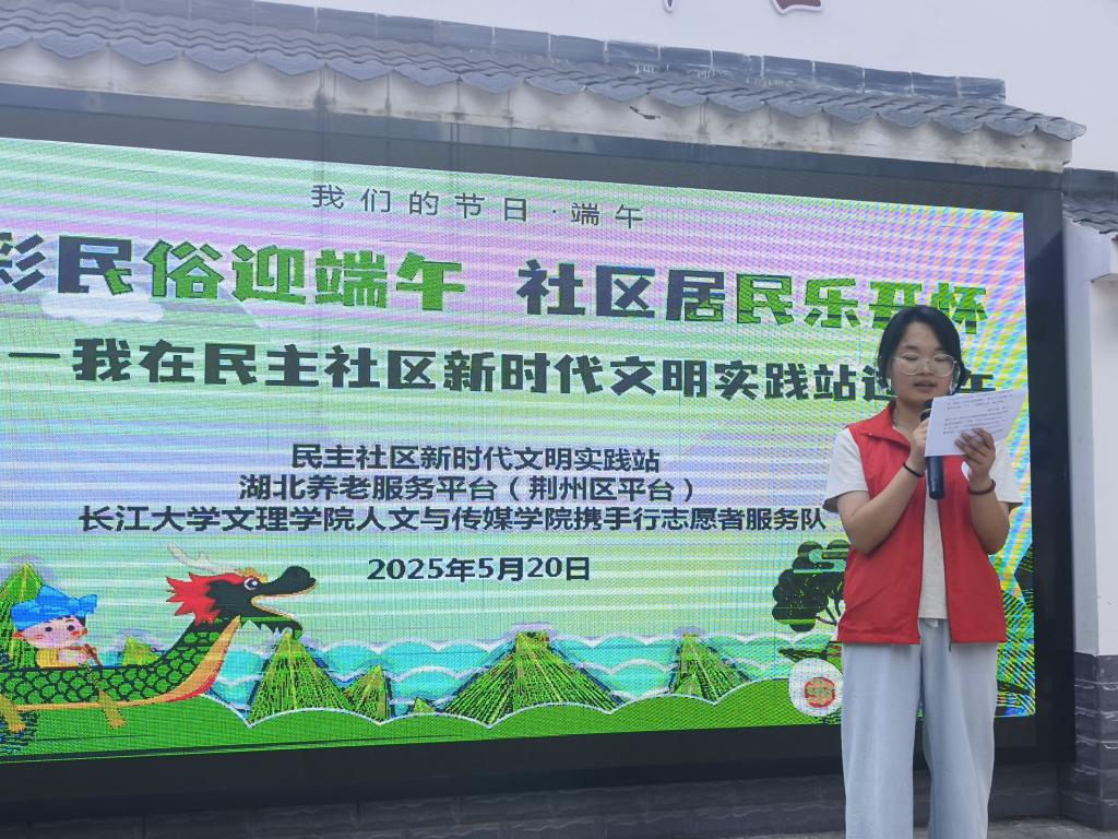 本网讯(通讯员 陈美琪)5月20日,bw必威西汉姆联官方网站人文与传媒公司携手行志愿者服务队联合荆州区西城街道民主社区新时代文明实践站、湖北养老服务平台(荆州区平台),共同开展“我们的节日·端午”主题系列活动,以“多彩民俗+便民服务”模式,让居民感受传统节日魅力与贴心服务。