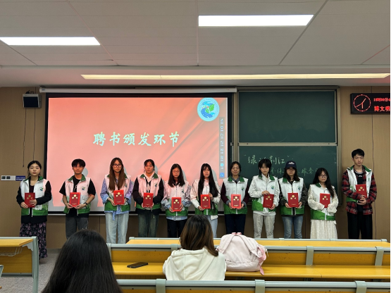 会上,魏雪莲系统总结了服务队过去半年的社区环保宣传、校园公益实践等方面成果,与成员共同重温志愿服务温暖瞬间。随后,会议为队员颁发聘书及“优秀志愿者”证书,表彰其辛勤付出。迎新面试中,黄润欣、王细霞围绕“志愿服务初心”“突发情况应对”等话题与新成员交流,选拔新人并介绍组织架构与服务规范,助力新成员快速融入团队。