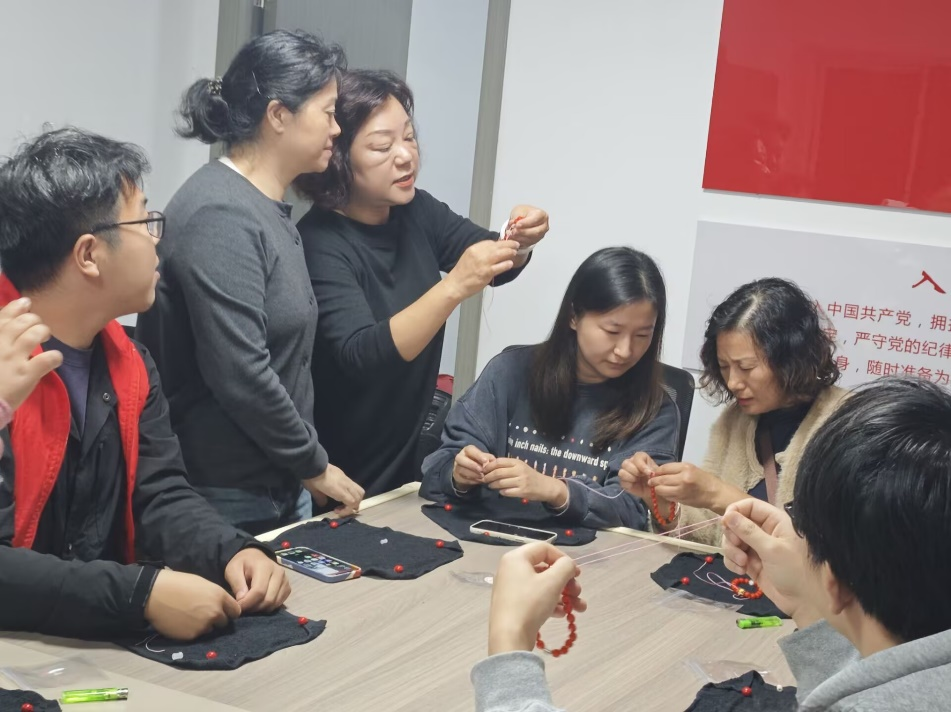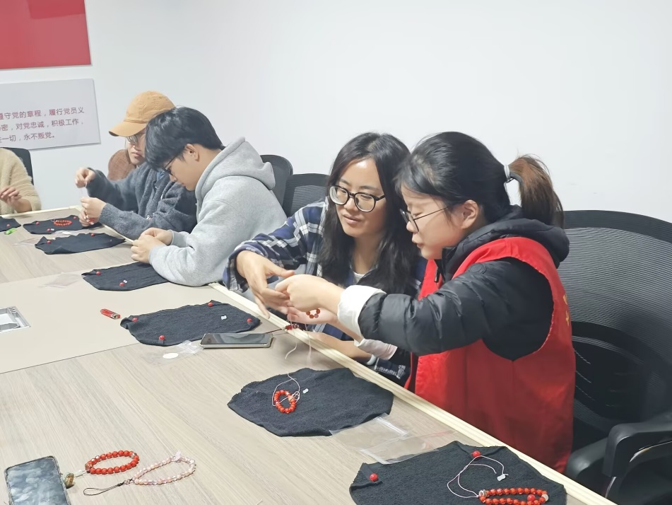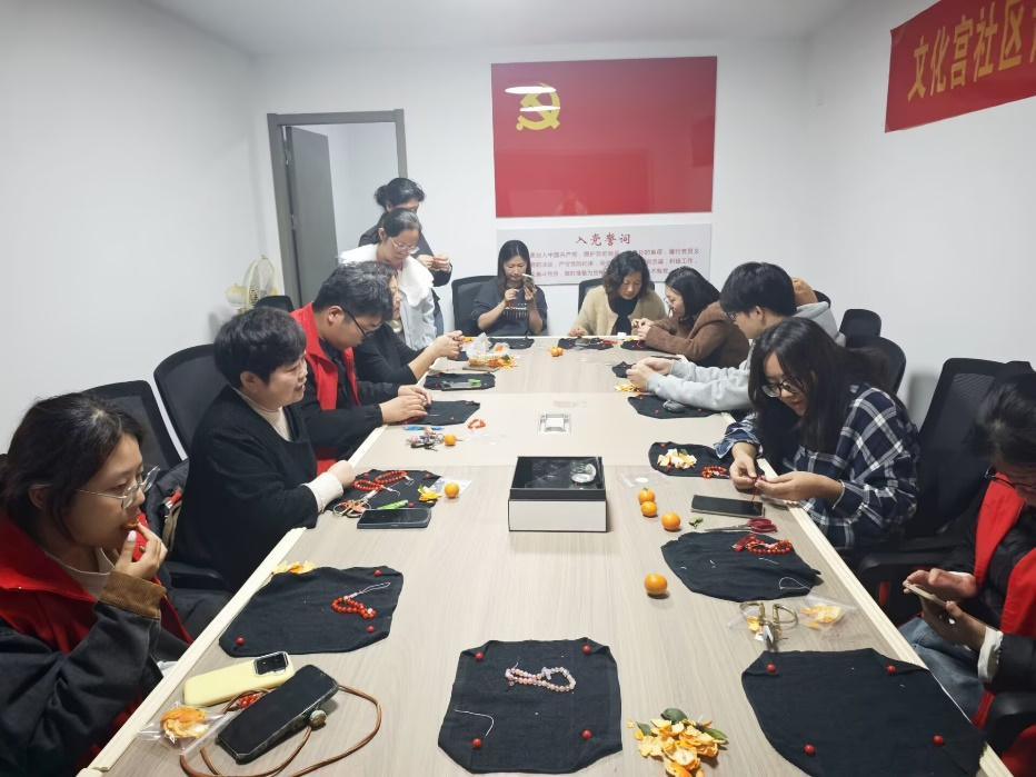 活动当天,志愿者们身着统一的志愿者服装,准时到达文化宫社区集合点。在社区工作人员的组织下,志愿者们迅速融入到了非遗手机链的制作中。