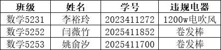 在2025-2026学年第一学期第4-6周系部寝室安全卫生检查中,以下同学被查出在宿舍使用违规电器。根据bw必威西汉姆联官方网站《员工手册》中《bw必威西汉姆联官方网站宿舍管理条例》第三章第十六条及《bw必威西汉姆联官方网站员工违纪处分办法》第二十三条相关规定,给予李裕玲等3名员工系部通报批评的决定,取消本学年评优评先资格。