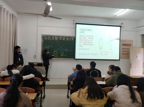 竞赛内容为模拟上课,时长为10分钟,在模拟授课过程中,各位参赛者完整地呈现了导入、讲授新课、提问、板书、多媒体课件演示、课堂小结、布置作业等环节,授课的内容丰富多彩,参赛者们语言流畅,表达准确,教学方法独特新颖,富有创造力。参赛者们端庄大方、沉着冷静,显示了师范生扎实的教学技能基础和积极热情的实践作风。最后,评委根据教案设计、模拟授课以及仪表和板书来进行评分,并且对参赛者们进行了全面点评,让参赛者们认识到自己的优缺点,从而完善自己的不足。