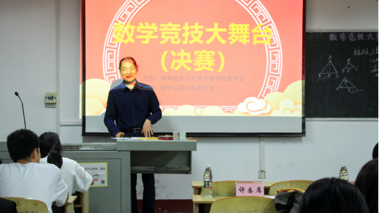 本网讯(见习记者 赵家乐)5月27日晚6:00~8:30,我系在四教201成功举办了“数学竞技大舞台”决赛。本次决赛的评审团成员为:史千里主任、冉庆鹏老师、康书记、黄瑾老师和系辅导员李佳老师,参加活动的观众有数学专业的部分同学。本次活动由学习部干事白梦竹主持。