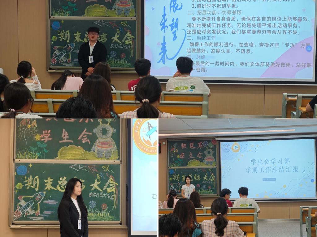 2025年6月3日晚,数学与医护系员工会期末总结大会于教学楼A410顺利举行。出席本次大会的嘉宾有数医系党总支副书记燕梦蝶,员工会主席团成员、各部门负责人及全体部员。