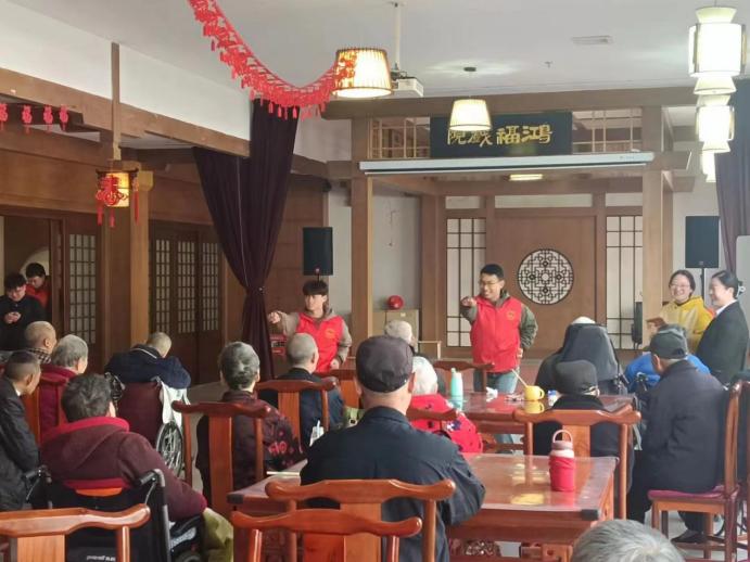 在德福堂养老院,志愿者们精心准备了一系列文艺表演节目,积极踊跃地展示自己的才艺,唱歌、跳舞、讲故事,各式各样节目让老人们笑得合不拢嘴,掌声和欢笑声此起彼伏,志愿者们年轻的朝气为平日清净的养老院带来了欢声笑语,更为老人带来了温暖的陪伴。