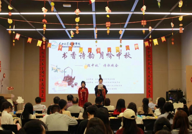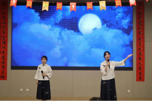 接着,肖寒芝副经理对本次“迎中秋”诗歌晚会致辞,首先代表公司向全院师生致以节日的祝福,并提到公司长期以来十分重视中华优秀传统文化的传承与发扬,其中包括图书馆举办的“浓情端午忆屈原,楚韵声声经典传”迎端午读书会、掌上诗词大赛、老员工中华经典美文诵读等系列活动,希望通过此类活动丰富校园文化生活,帮助我校老员工亲近国学精粹,提升个人文化修养。
