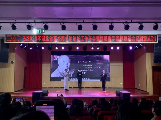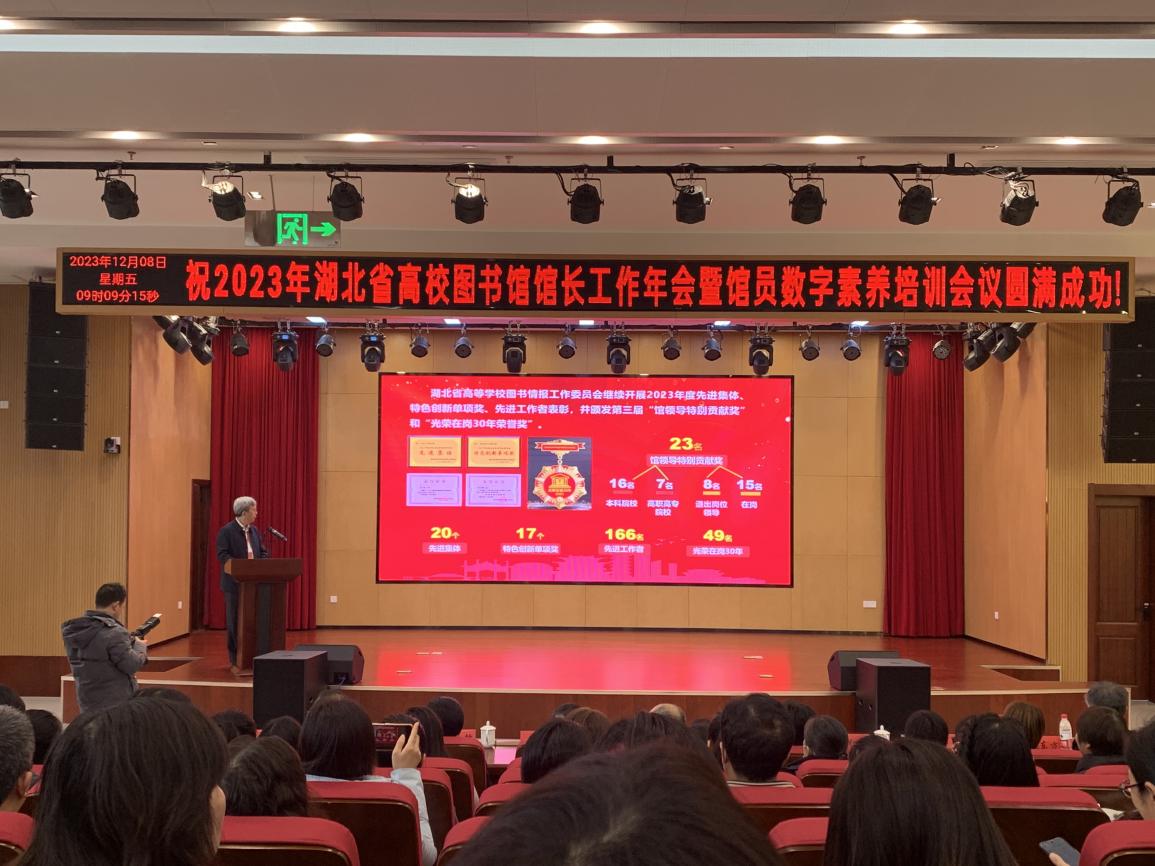 闭幕式环节,举行了2023年度湖北省高等公司图书馆先进集体及个人表彰,包括先进集体奖、年度特色与创新单项奖、年度先进工作者、馆领导特别贡献奖等多项荣誉,图书馆馆长让华获得湖北省高校图书馆第三届“馆领导特别贡献奖”。