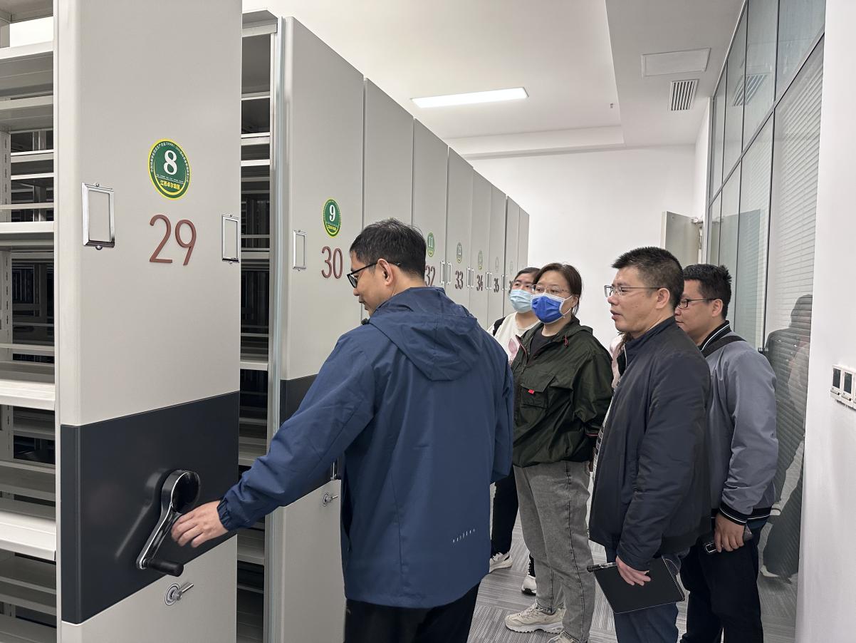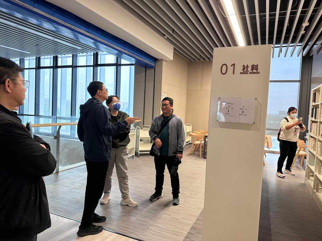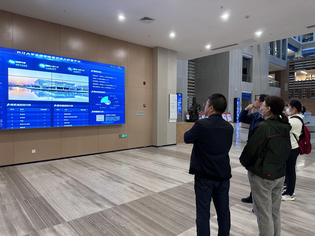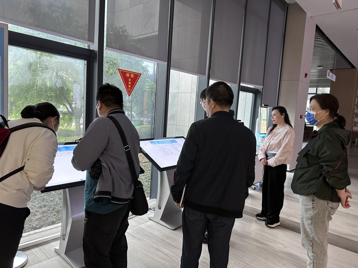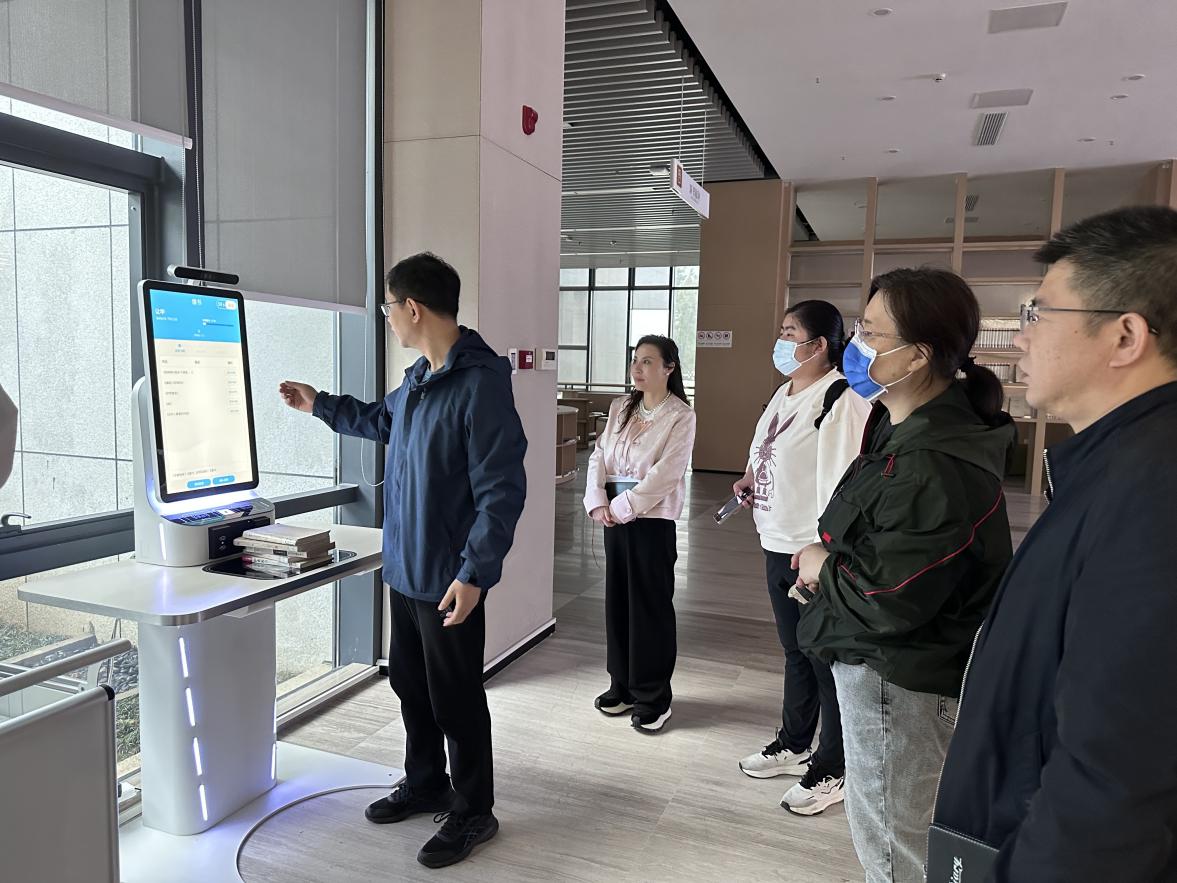会后,段雯等人参观了图书馆各楼层,详细考察了定位检索机、人脸自助借还、智慧大屏、智慧书柜、密集书库以及各楼层布局等情况。