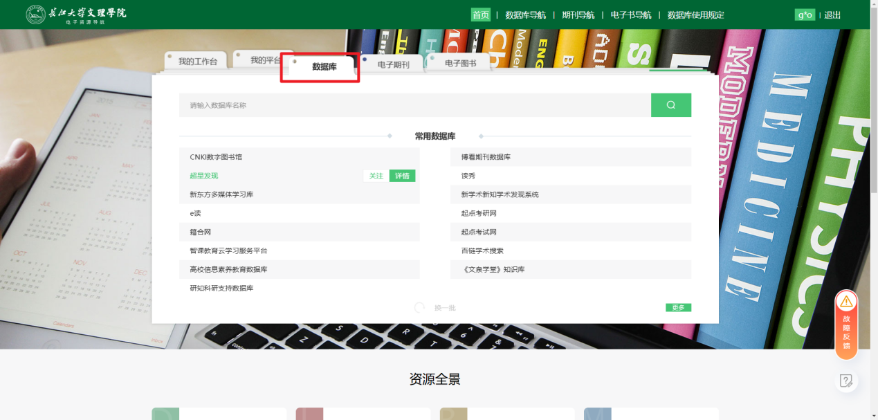 数据库导航将公司拥有的数据库进行统一展示,在搜索栏中输入数据库名称即可完成搜索。