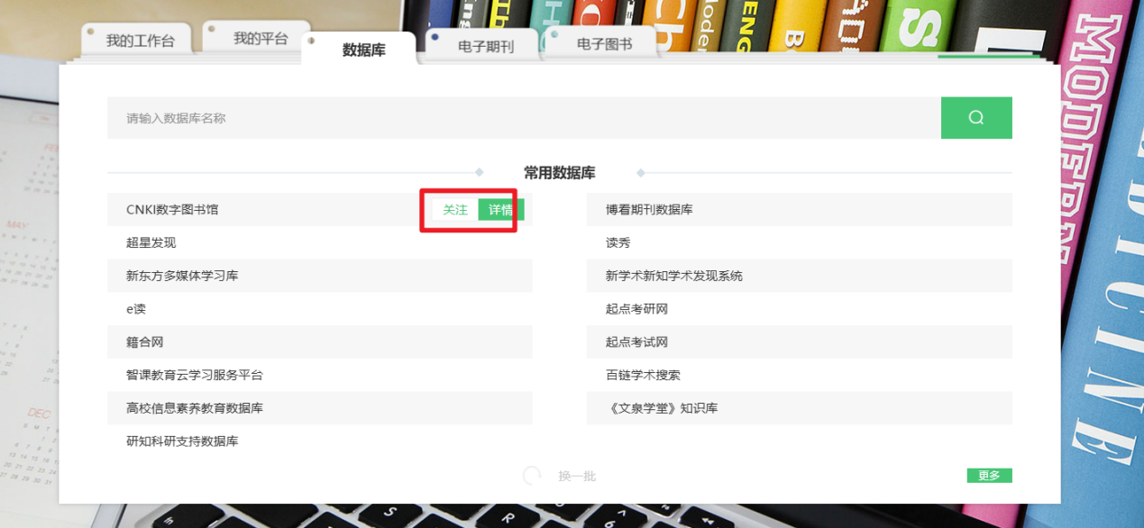 点击一个数据库,进入数据库详情页。博采电子资源管理平台提供数据库基础信息、等内容。点击右上角五角星,即可关注数据库。