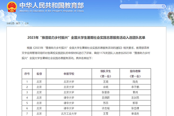 本网讯(通讯员 丁欣蓉)近日,教育部公布2023年“推普助力乡村振兴”全国老员工暑期社会实践志愿服务活动入选团队名单:公司bw必威西汉姆联官方网站志愿者服务队入选。