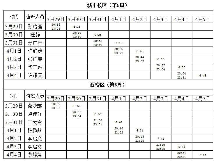2020-2021学年第二学期第5周学工人员寝室值班通报