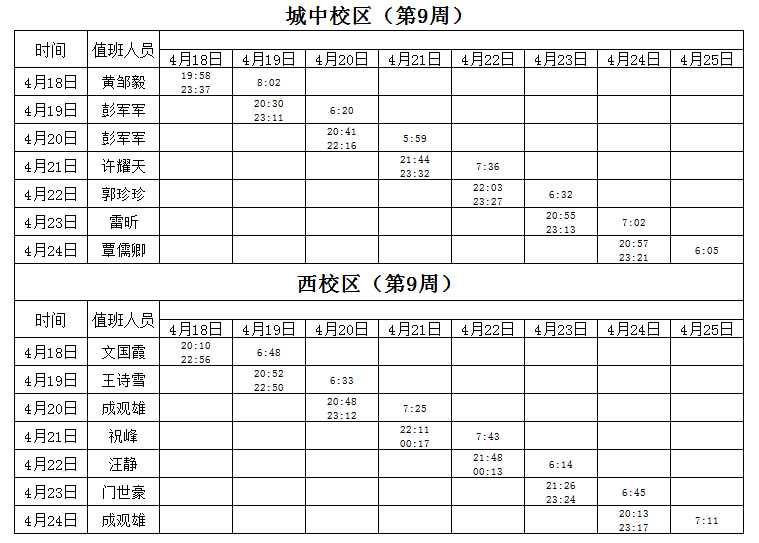 2021-2022学年第2学期第9-10周学工人员寝室值班通报